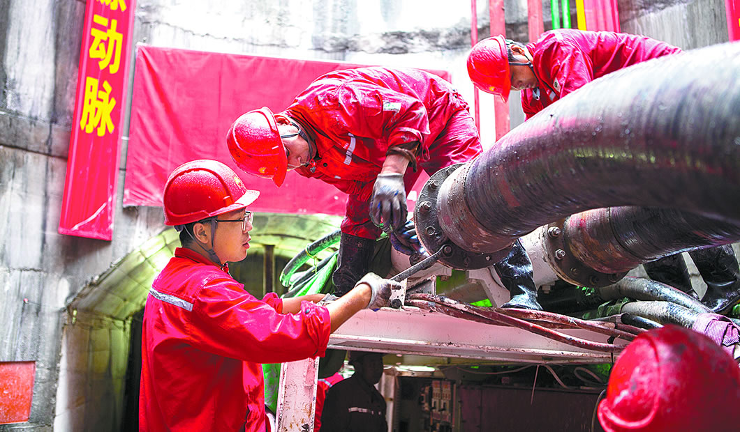 攻坚克难。10月23日,管道局四公司广西支干线盾构项目参建员工正在江底驾驭盾构机穿越潇水河。他们发扬“攻坚克难、战则必胜”的盾构精神,立足岗位、找准定位,为国家油气能源通道保驾护航。宋洋 摄