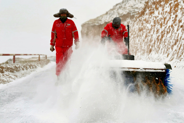 员工清扫路面积雪,保障运输畅通。谢信萍摄