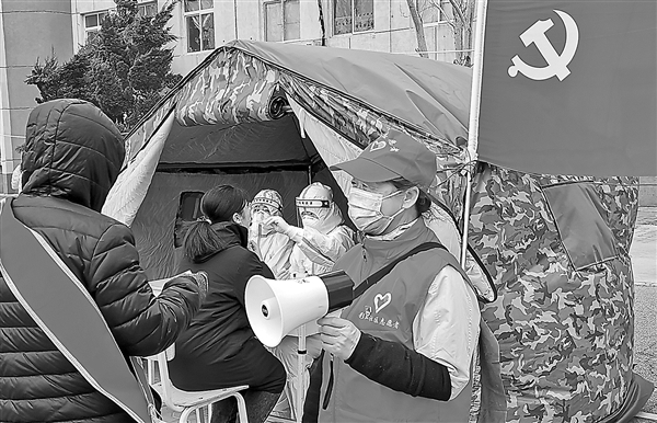 图为退休职工党员李晓静(右)在核酸检测点服务。刘宝素摄