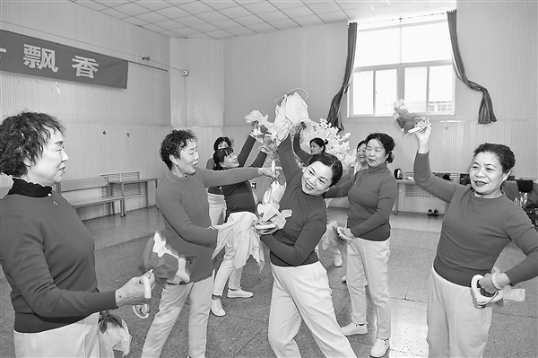 中原油田康乐项目部离退休职工第六党支部书记梁淑珍(左二)热爱文艺,退休后,带领辖区舞蹈爱好者组建舞蹈队,丰富大家的金秋生活。舞蹈队成员每天在活动室坚持训练。3月初,舞蹈队开始学习太极健身球,引导老同志加强锻炼。