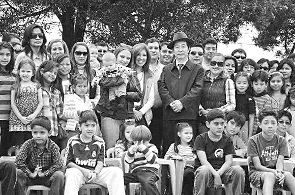 孩子们的父母被节日的气氛所感染,几位怀抱小孩的妇女笑意盎然,在皮卡车旁边站成一排。