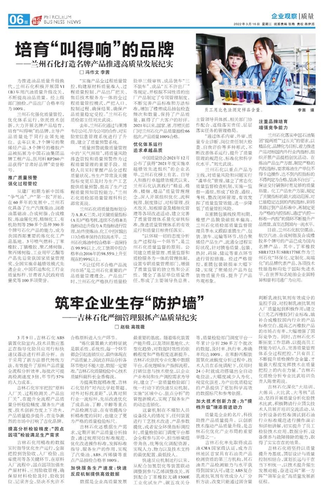 “实施产品全过程质量管控,构建原材料质量准入、过程质量控制、产品出厂把关、售后技术服务为一体的全过程质量管控模式,严把入口、控制过程、确保结果,确保产品质量稳定受控。”兰州石化质检部主任刘光武说。