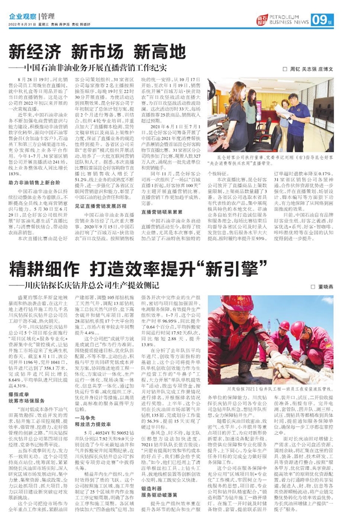 精益井内生产组织,生产时效得到了质的飞跃。这个公司按照施工区域、施工井型制定了25个区域井内作业施工工序定额周期,明确了各作业工序和施工周期。各区域持续加大“四条曲线”应用、加强各开次中完作业的生产组织,密切与项目组加强固井、电测服务保障,有效提升生产组织效率。1~7月,这个公司生产时率96.95%,同比提升了0.64个百分点,平均拆搬安井间运行时间17.92天/队次,同比缩短2.88天,提升13.8%。