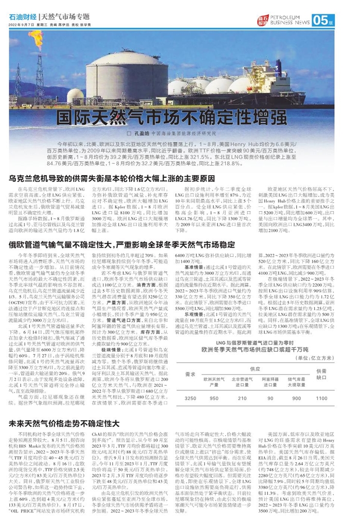 不同机构对冬季全球天然气价格走势预测差异较大。8月5日,据咨询机构IHS Markit发布的天然气价格预测报告显示,2022~2023年冬季天然气TTF月度均价在40~45美元/百万英热单位之间波动。8月16日,在欧洲的现货交易中,TTF价格突破2.5美元/立方米(约83美元/百万英热单位)大关。同日,俄罗斯天然气工业股份公司警告称,如果这一趋势持续下去,今年冬季欧洲的天然气价格将进一步上涨60%,达到超4美元/立方米(约133美元/百万英热单位)。8月17日,“OIL PRICE”网站发表市场研究机构ChAI的报告“欧洲的天然气价格会涨到多高?”。报告显示,从今年10月至2023年3月,TTF月均价都将超过300欧元/兆瓦时(约88美元/百万英热单位)。普氏9月1日发布的预测报告显示,今年11月至2023年1月,TTF月度均价将高于50美元/百万英热单位,2023年2月、3月TTF月度均价将逐步下跌至48美元/百万英热单位和43美元/百万英热单位。