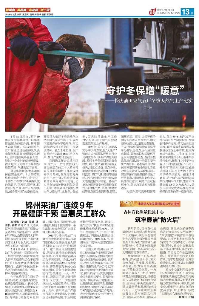 长期以来,锦州采油厂把员工健康摆在企业发展的战略地位,积极将促进健康的理念融入企业发展的全过程。近年来,为深入贯彻落实中国石油集团、勘探与生产分公司、辽河油田公司健康企业创建相关要求,锦州采油厂认真按照健康企业创建相关要求,紧密结合采油厂实际和员工健康现状,从健康制度、健康环境、健康管理与服务、健康文化着手,制定“235”健康企业创建工作思路,为企业健康与安全生产良性协调发展提供了保障。